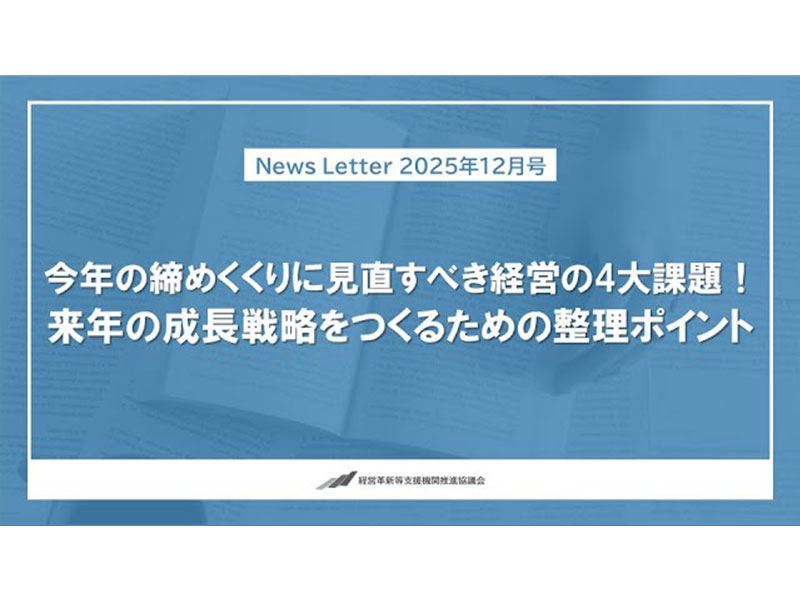 12月新着情報&新着動画 投稿日時 2025年12月1日 (2025年12月1日) 今年の締めくくりに見直すべき経営の4大課題!来年の成長戦略をつくるための整理ポイント 【2025年12月号】経営課題4選 ご案内資料ダウンロード事業承継税制で税負担を軽減できる「特例承継計画」の提出期限が延長されました! 【2025年12月号】事業承継税制 ご案内資料ダウンロード